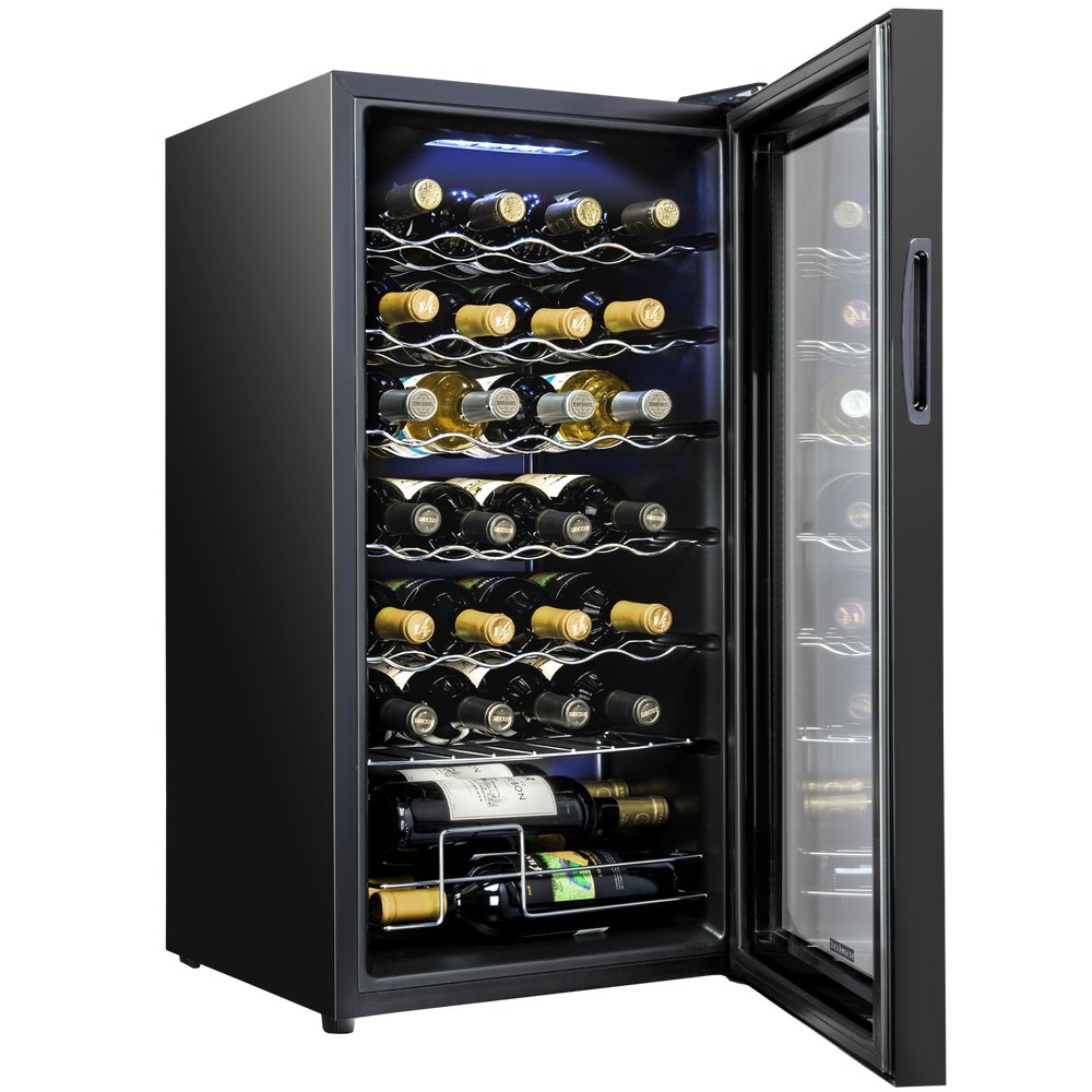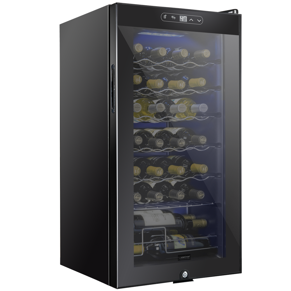 Keeping your wine collection has never looked better with the Schmecke 28 Bottle Freestanding Wine Cooler Refrigerator with Locking Door and Digital Temperature Control.